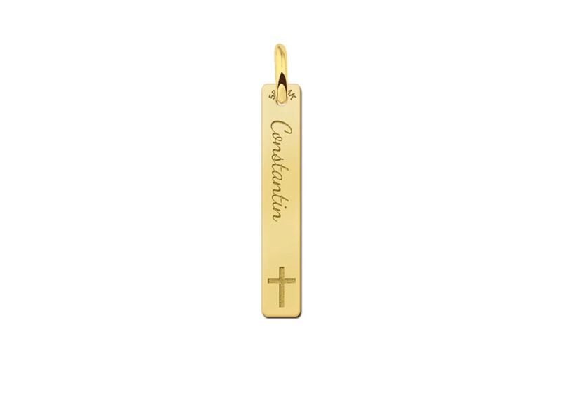 In dit gouden communie bar hanger is een naam prachtig gegraveerd