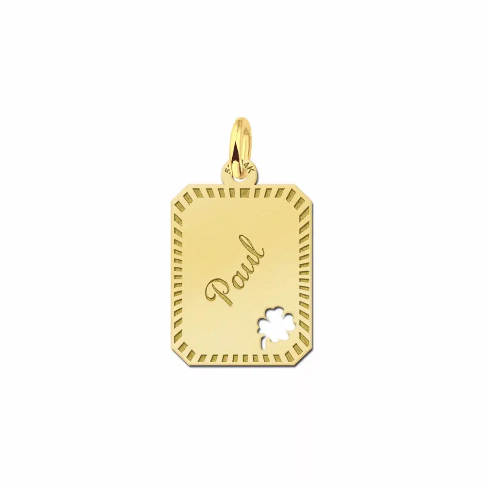 De gouden graveerplaat is voorzien van een bewerkte rand zodat de rechthoekige vorm mooi geaccentueerd wordt. Met deze gouden graveerplaat wordt het geluk benadrukt in de breedste zin van het woord. Het klavertje vier dat uit dit gouden graveerplaatje is gehaald staat hier symbool voor. Leuk voor hem en haar om cadeau te doen! Wie wil jij geluk wensen? Deze 14 karaat gouden graveerplaat is ongeveer 14 x 18mm groot en heeft een dikte van 0.4mm. Het graveerplaatje wordt uiteraard voorzien van de naam van jouw keuze. Deze zullen wij schuin en met een sierlijke letter graveren in de graveerplaat. Bestel het nu!