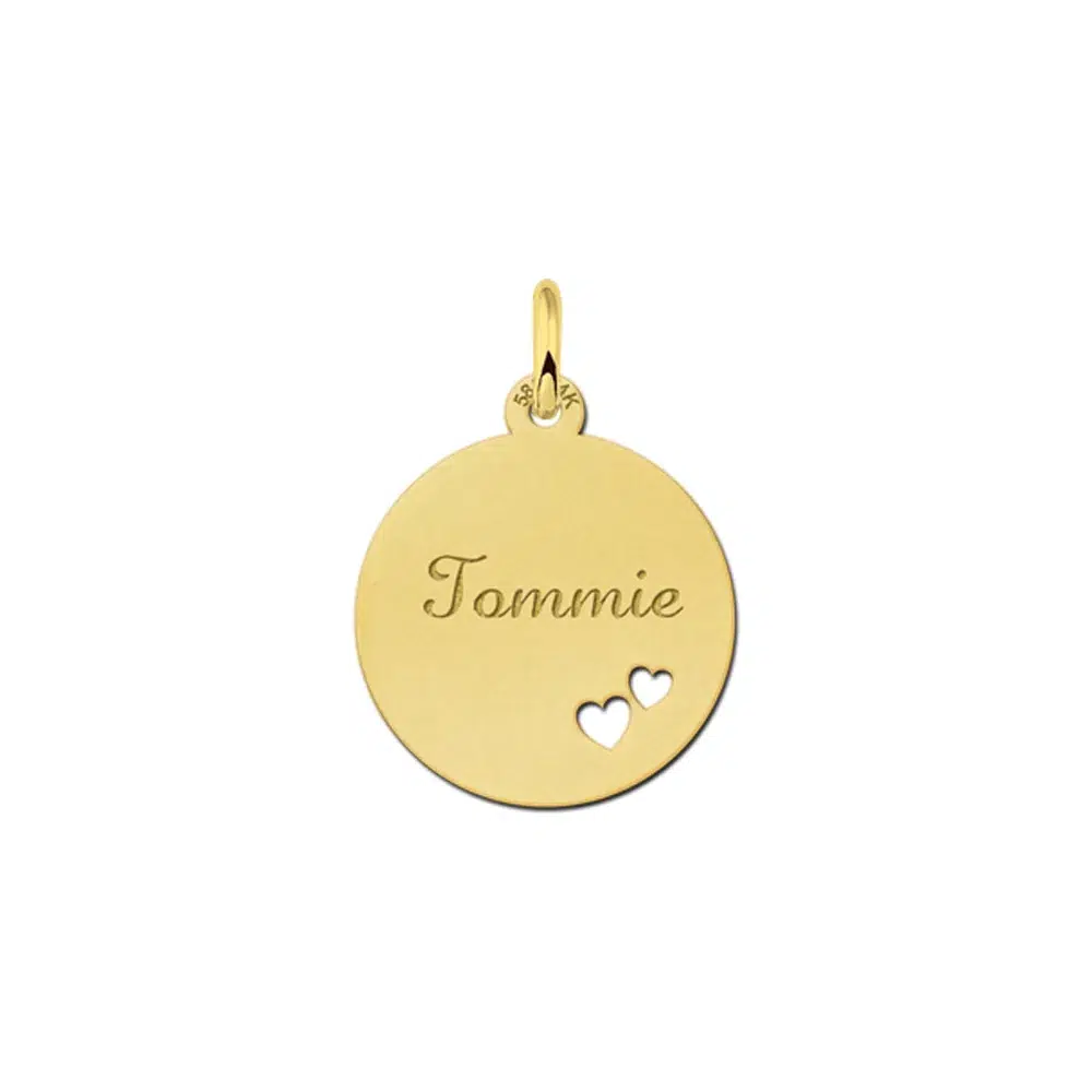 Dit gouden hangertje met je naam is met twee harten bewerkt.