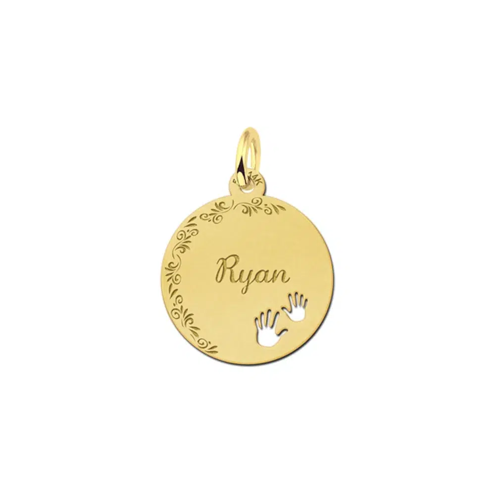 Het hangertje van goud is voorzien van twee handjes en daarom is het wellicht een leuk idee om de naam van je kindje er in te laten graveren.