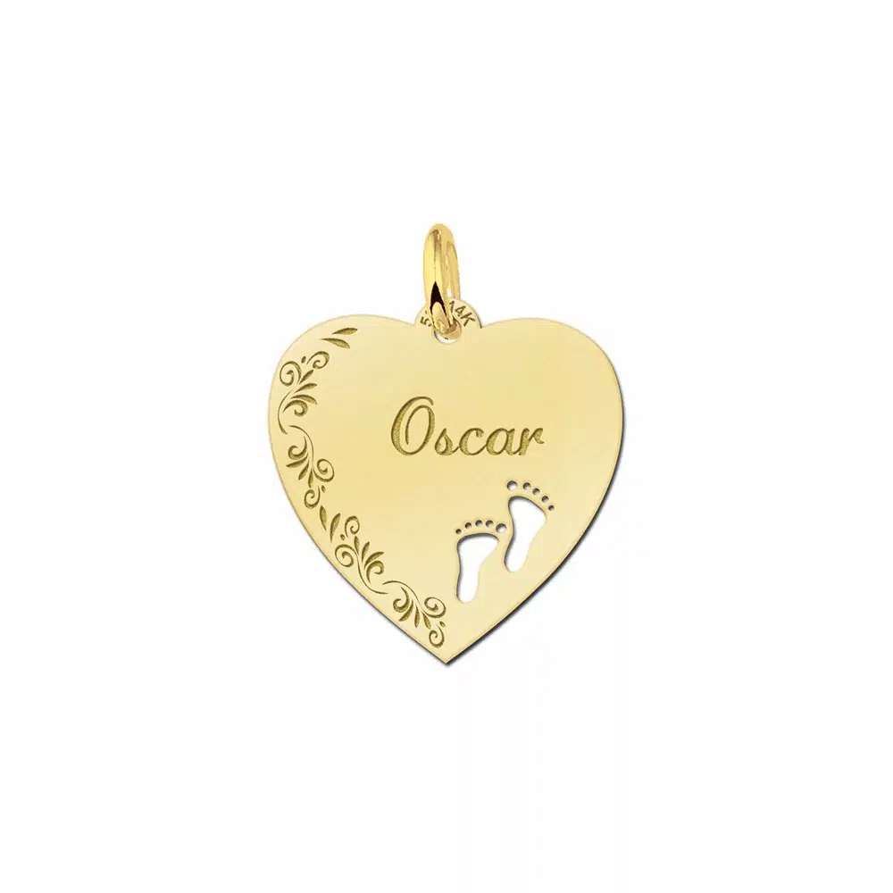 Het gouden hart met bloemrand is ca. 19 x 19 millimeter groot en is voorzien van twee schattige babyvoetjes.
