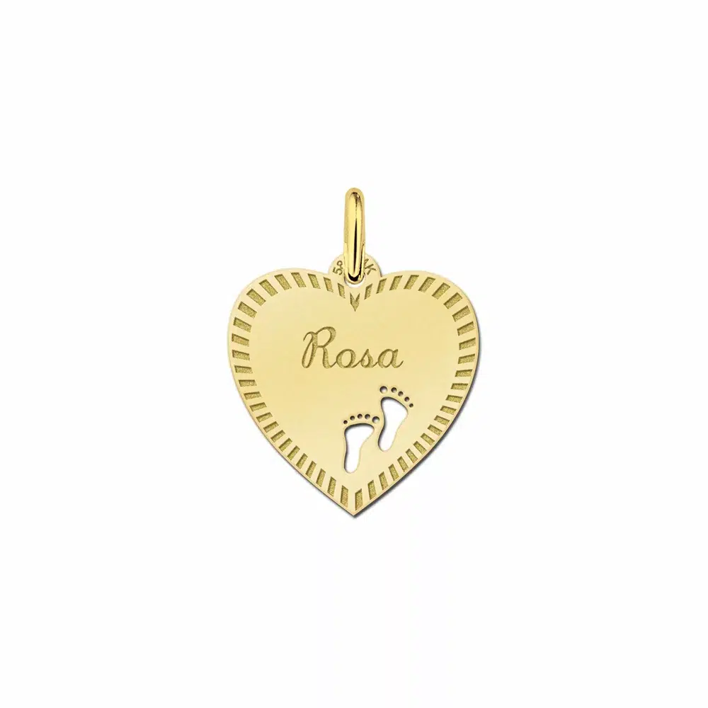 Het gouden hart is ca. 17 x 17 millimeter groot en is voorzien van een mooie sierrand en twee schattige babyvoetjes.