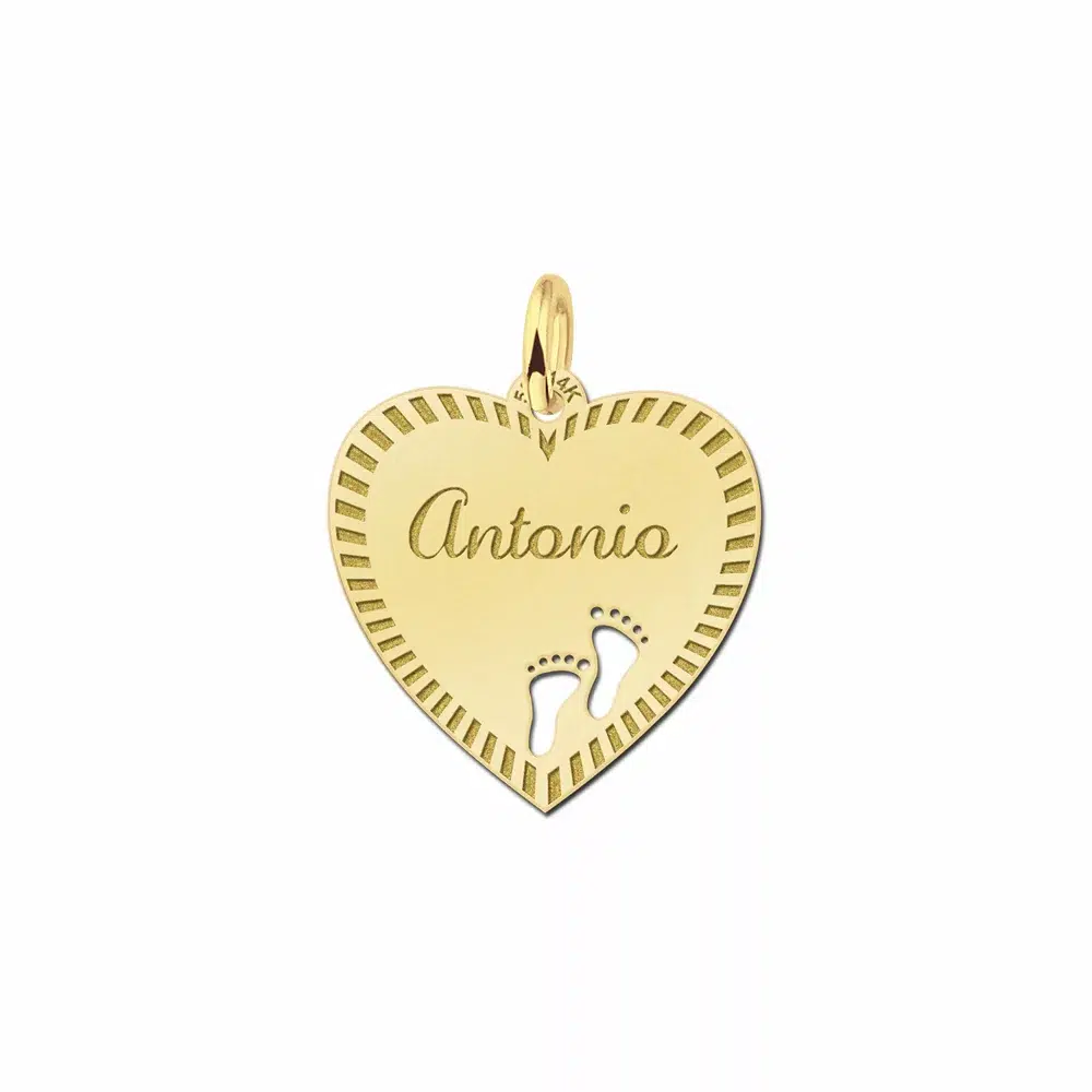 Het gouden hart is ca. 19 x 19 millimeter groot en is voorzien van een mooie sierrand en twee schattige babyvoetjes.