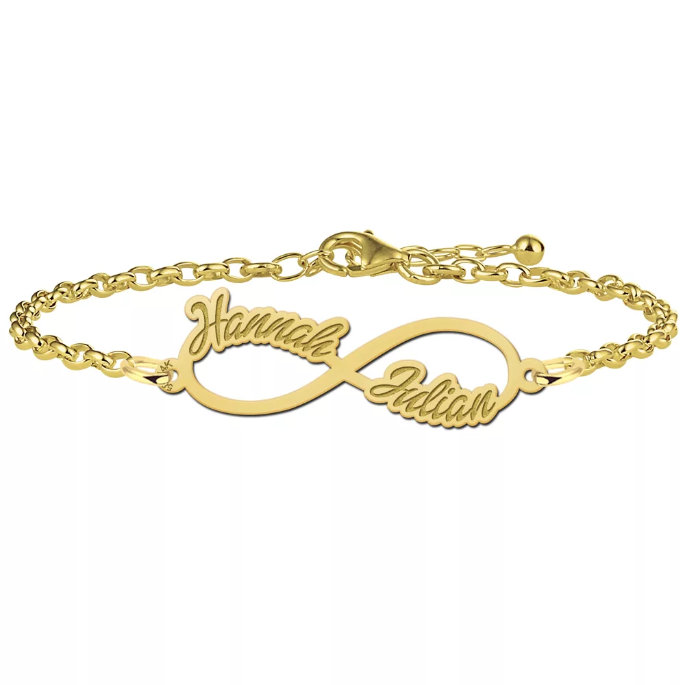 Een schattige 14 karaat gouden infinity armband welke je kunt personaliseren met twee gravures.