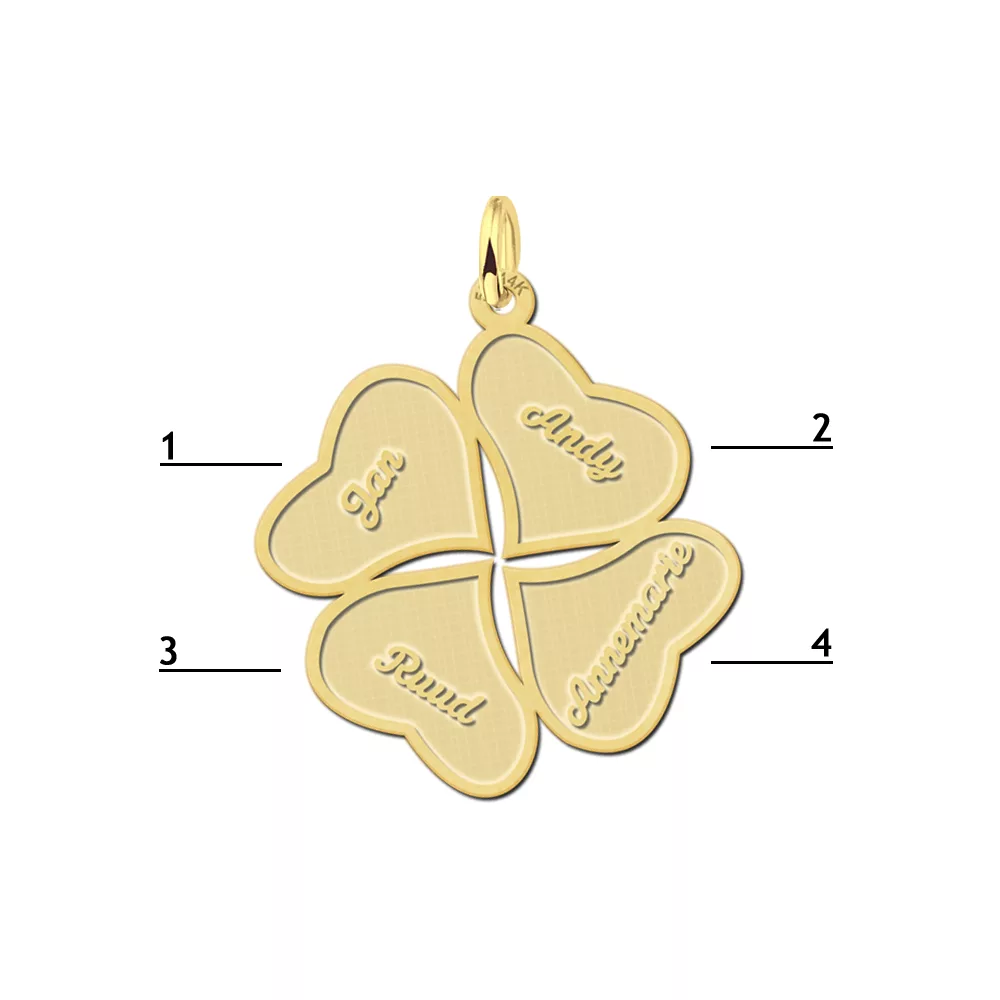 Gemaakt van 14 karaat goud heeft de klavertjevier ketting met 4 blaadjes een gepolijst uiterlijk dat glanzend en mooi blijft. De bladeren van de klavertjevier hanger zijn hartvormig, wat een uniek karakter creлert. In elk blad kan een naam worden gegraveerd. En met ruimte tot 10 tekens, is bijna elke naam mogelijk.