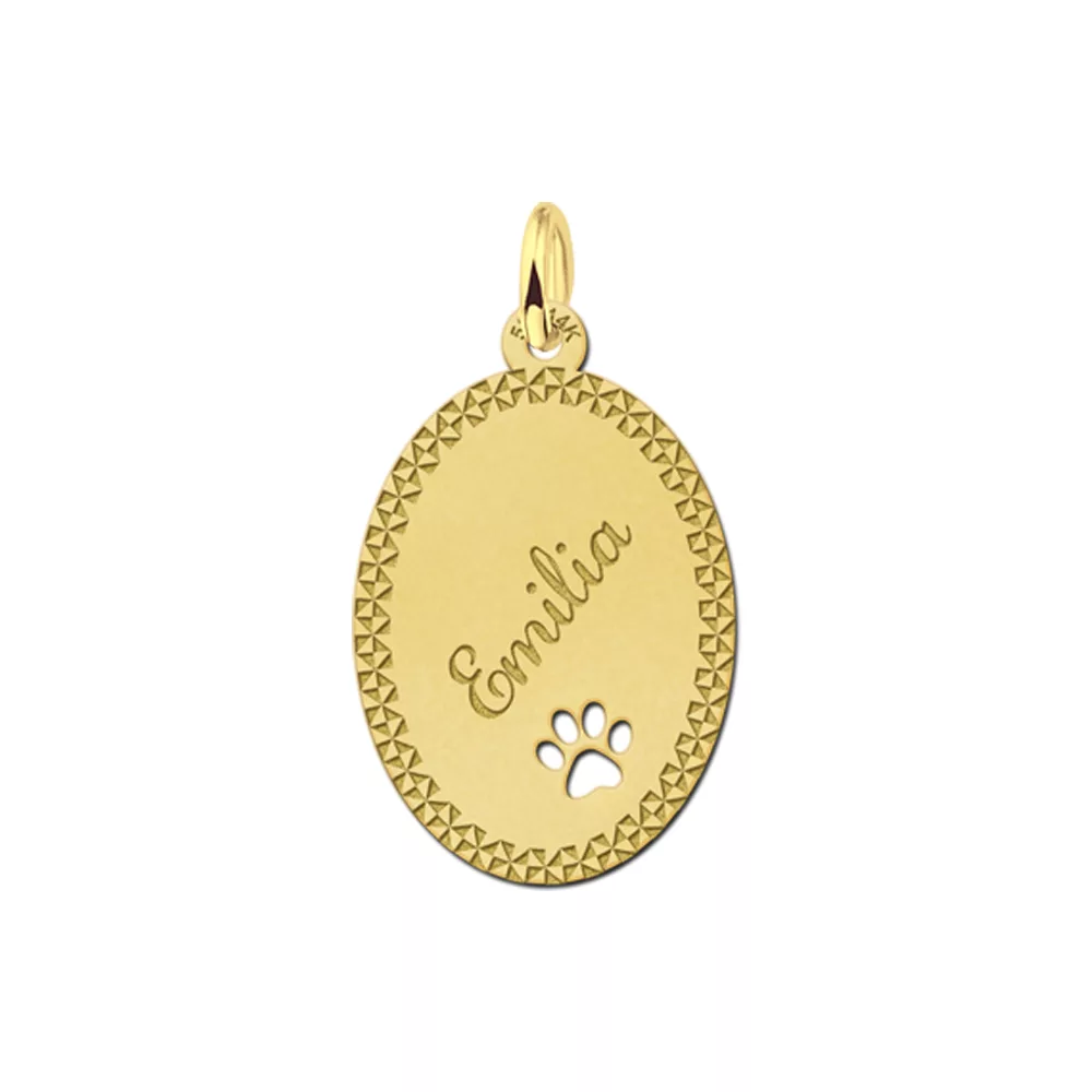 Is jouw hond jouw trouwe vriend ? Bestel dan dit gouden naamplaatje en laat ons de naam van het beestje erin graveren Het ovale naamplaatje van goud heeft een afmeting van 16 x 22 mm en is dus zeer geschikt voor om jouw hals te dragen. Op deze manier heb jij jouw trouwe viervoeter altijd bij je. Vergeet alleen niet om er een gouden ketting bij te bestellen !!