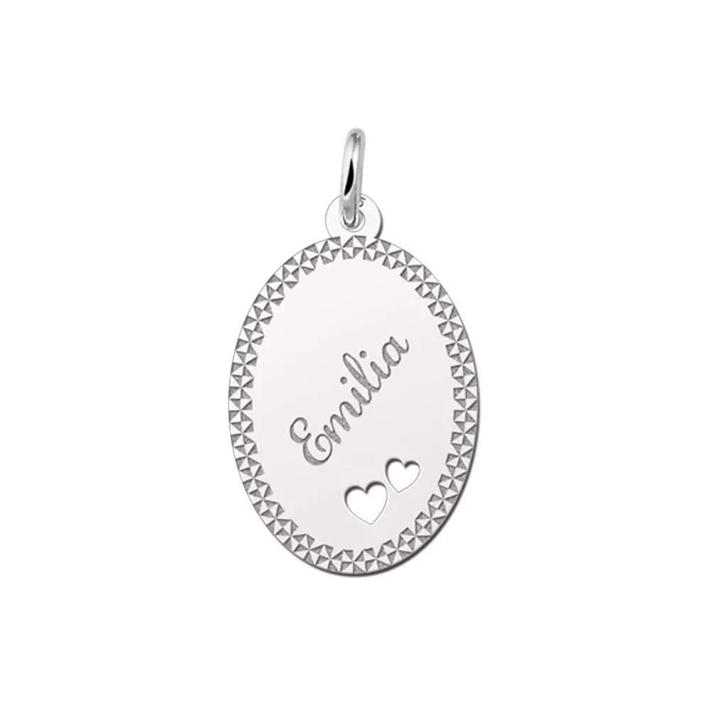 Deze zilveren hanger is ovaal en ca. 16 x 22 mm groot en heeft als afwerking een buiten gewoon sierlijke rand. In de hanger van zilver waar je een naam in kan laten graveren zijn ook nog twee hartjes verwerkt, die staan uiteraard voor jullie onvoorwaardelijke liefde! Deze zilveren hanger met oogverblindende sierrand, kunnen wij voor jou graveren met een naam naar jouw keuze! Hoe romantische is dat, om de naam van je geliefde om je hals te dragen in een zilvere hanger! Vergeet vooral niet een bijpassende ketting mee te bestellen.