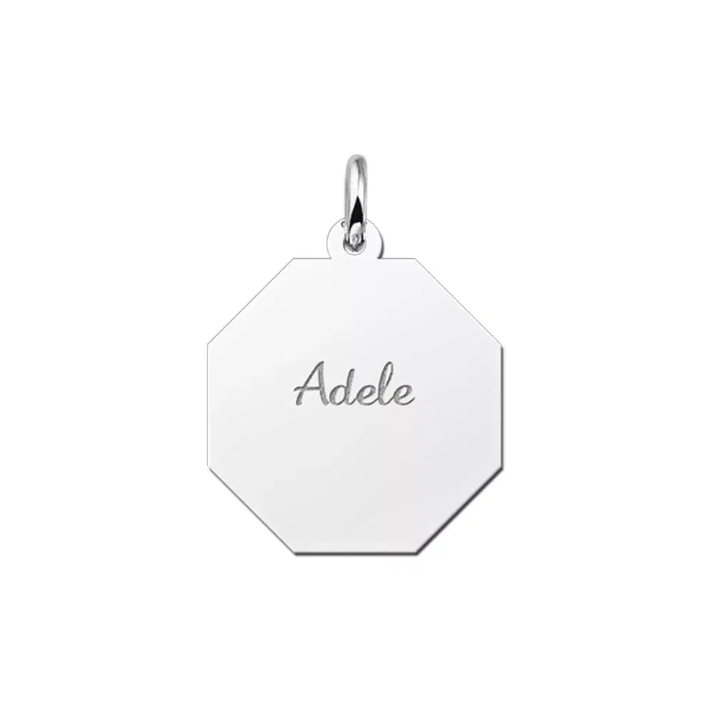 Dit is een mooie achthoekig graveerplaat van zilver waar jij jouw naam in kan laten graveren of misschien de naam van een dierbaren. Deze graveerplaat met naam gravure heeft een afmeting van 19 x 19 mm en heeft dus een hele mooie afmeting voor om jouw hals. Ook is het leuk om deze achthoekige zilveren graveerplaat met je naam gravure cadeau te geven aan bijvoorbeeld je vriend of je vriendin. Je kunt jouw naam in deze graveerplaat laten graveren of je zet de naam van je vriend of vriendin in je zilveren graveerplaat. Geef jouw naam naar keuze op en het wordt er met een sierlijke letter in gegraveerd. Het is een prachtig geheel als je er ook nog een mooie zilveren ketting bij besteld.