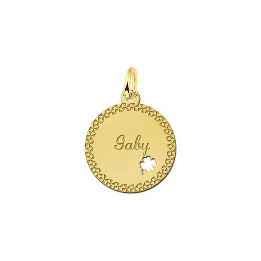 Dit is een schitterend gouden hangertje met je naam en een prachtig klavertje vier erin met een elegante sierrand.