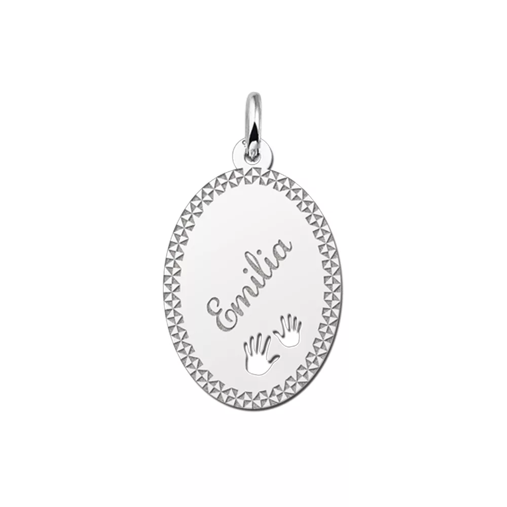 Het graveren van deze zilveren hanger doen wij graag voor jou. De zilveren hanger is ovaal en heeft een afmeting van 16 x 22 mm en is afgewerkt met een charmante sierlijke rand. In de zilveren hanger zijn ook nog twee handjes verwerkt, Het is toch geweldig? jij kiest deze hanger en wij graveren de naam van je kindje erin. Deze zilveren hanger met prachtige sierrand wordt voor jou gegraveerd met een naam naar jouw keuze!! Vergeet vooral niet een bijpassende ketting mee te bestellen.