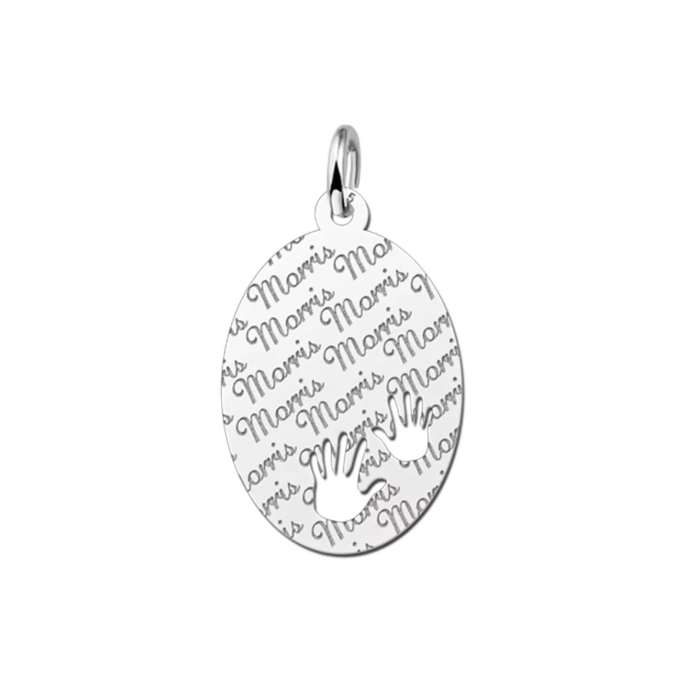 De ovale zilveren hanger waar je een naam in kan laten graveren wat je hier ziet is ca. 16 x 22 mm groot.