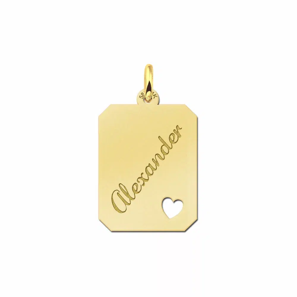 Deze achtkantige hanger is circa 16 x 20mm en 0.4 millimeter dik. De naamhanger wordt vervaardigd uit 14 karaat goud.