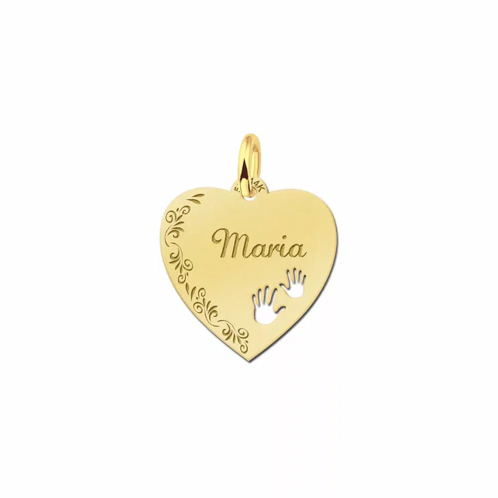 Het gouden hart met naam is ca. 17 x 17 millimeter groot en is voorzien van een sierlijke bloemenrand en 2 lieve handjes.