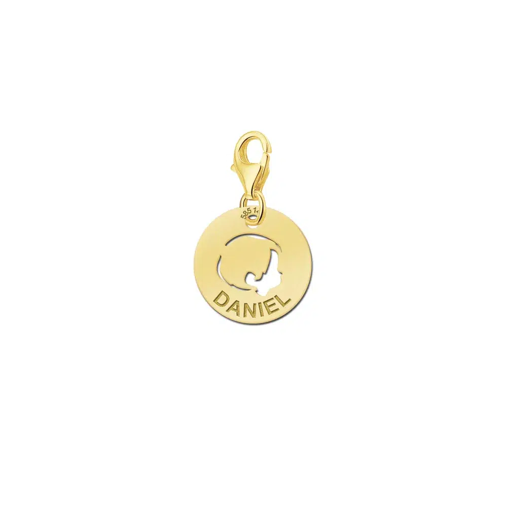 Hoera een jongen geboren! Deze 14mm ronde gouden naambedel baby met babyhoofdje jongen wordt voorzien met de naam van jouw keuze.