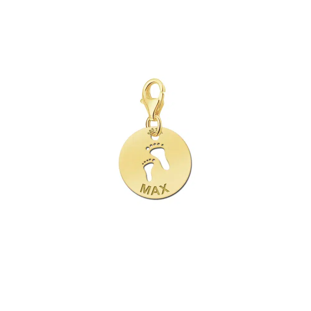 Deze 14mm ronde gouden naambedel baby met 2 schattige voetjes wordt voorzien met de naam van jouw keuze. Voetjes die schopten Voetjes die later lopen gaan voetjes die de grote wereld instappen Voetjes die stevig in het leven zullen staan… Door de karabijnhaak aan de hanger, kan je de naambedel makkelijk aan een armband of collier hangen. Het materiaal waar wij de naambedel van maken is 0,4 millimeter dik. Snelle levering en je betaalt geen verzendkosten!