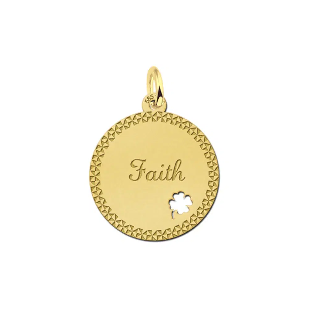Dit is een schitterend gouden hangertje met je naam en een prachtig klavertje vier erin. Wat een in het oog springend cadeau is dit om te geven. Of natuurlijk als cadeau voor jezelf met de naam van je geliefde !! Dat is wel een heel mooi gebaar. De naam van jouw geliefde in dit gouden hangertje met naam en een geluks klavertje vier. Wat romantisch !! Geef de naam van jouw keuze door en wij zullen het er met veel liefde in graveren. De doorsnede van het plaatje met je naam is 19 x 19 mm.