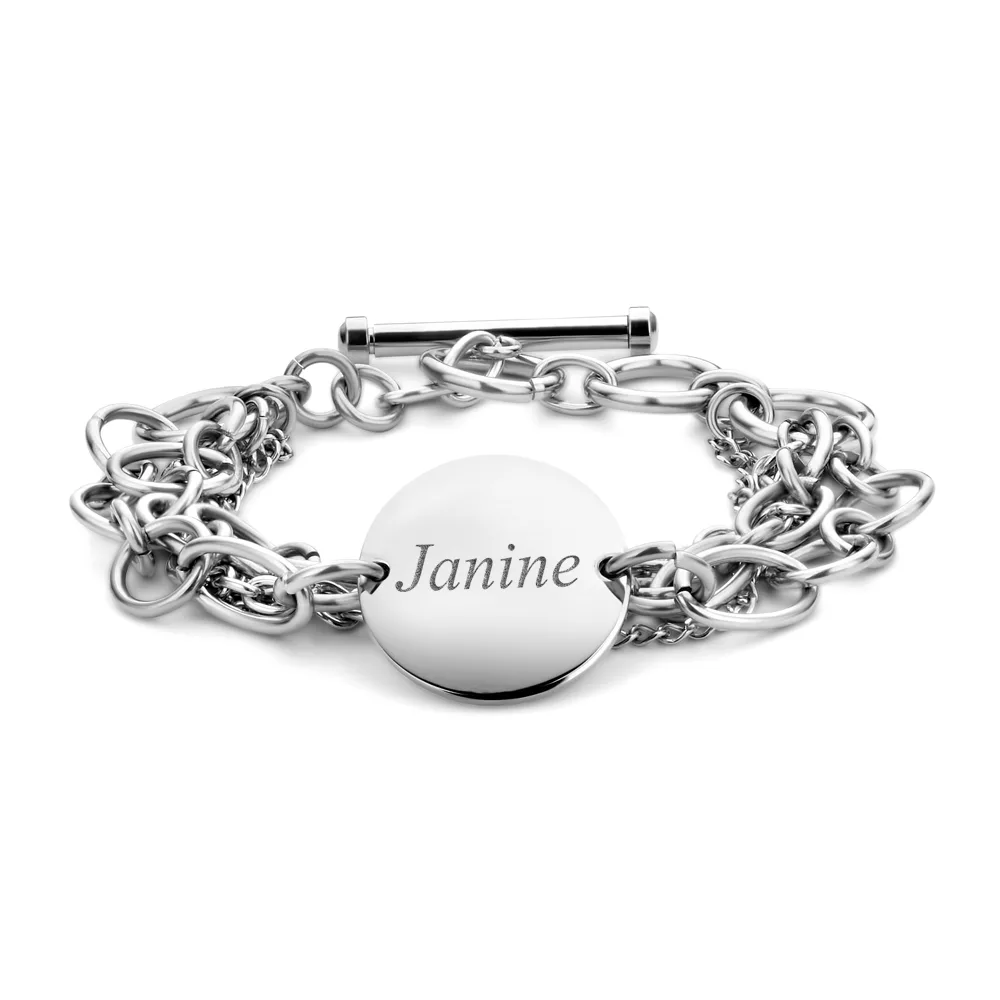 Ben je op zoek naar een speelse armband. Deze armband van roestvrij staal is gepersonaliseerd met een naam en kan worden gecombineerd met allerlei accessoires.