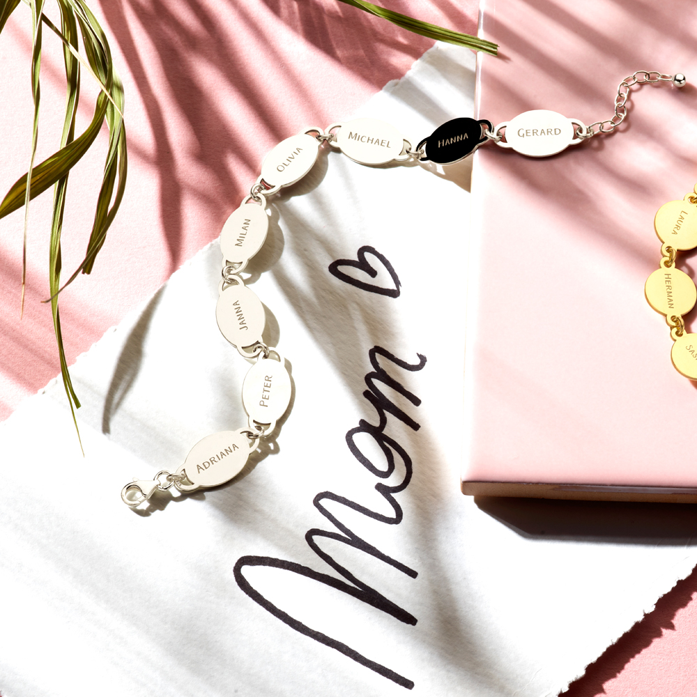 Deze zilveren naamarmband is een echt blikvanger. Personaliseer de armband nu met 8 namen.