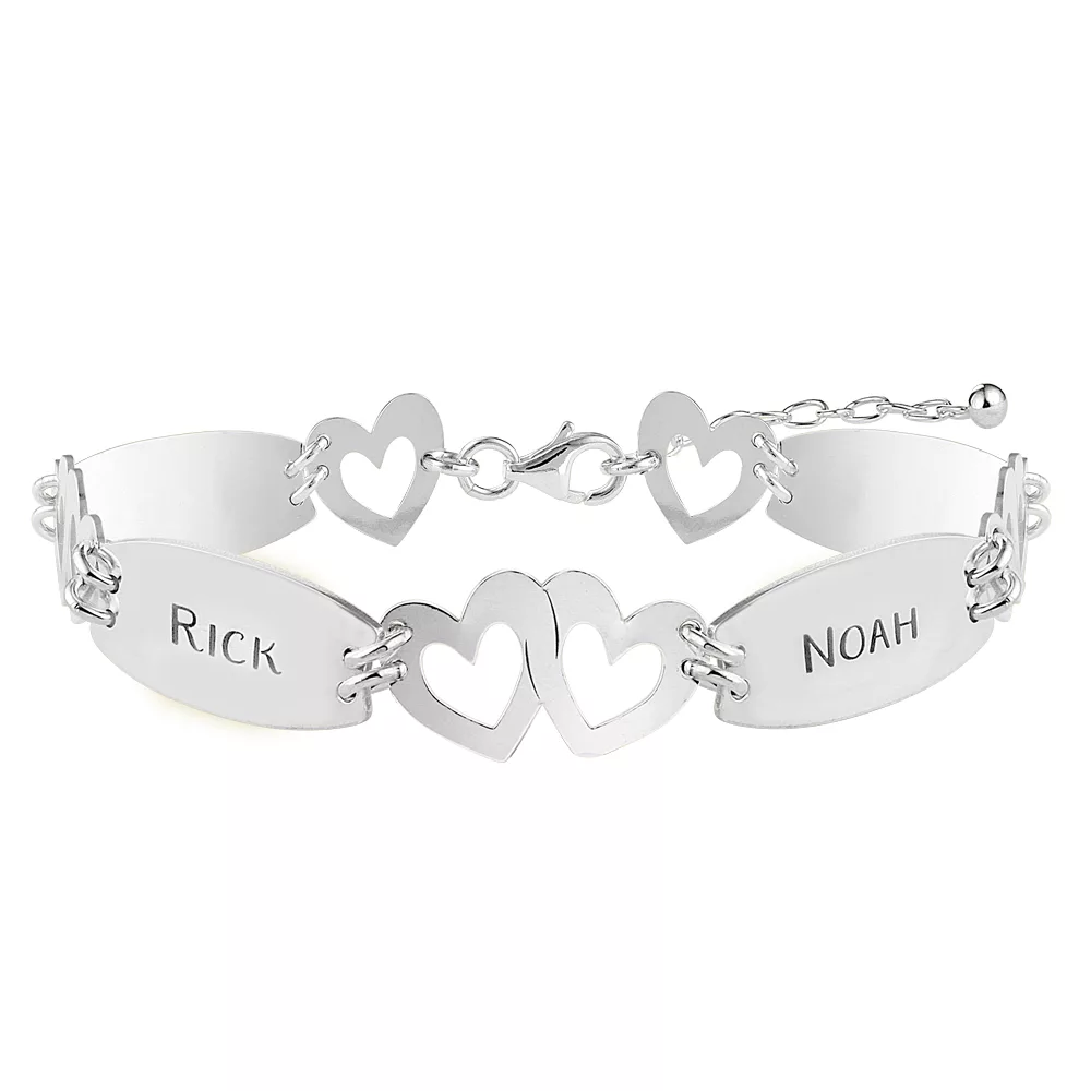 Deze zilveren armband met hartjes kan gepersonaliseerd worden met vier namen.