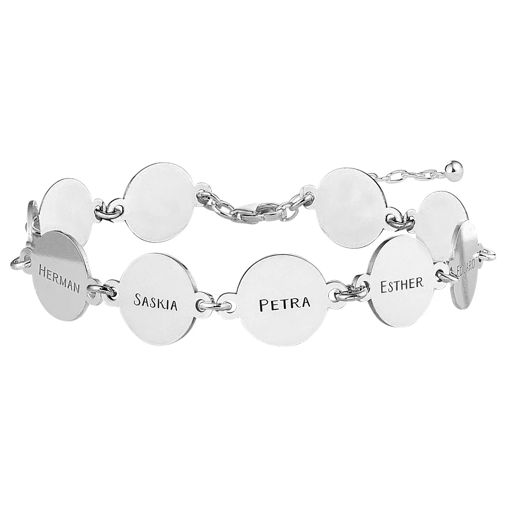 Deze zilveren armband met rondjes kan worden gepersonaliseerd met tiennamen. Daarom is het een echte blikvanger.