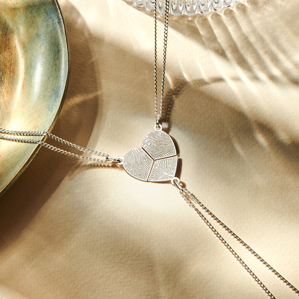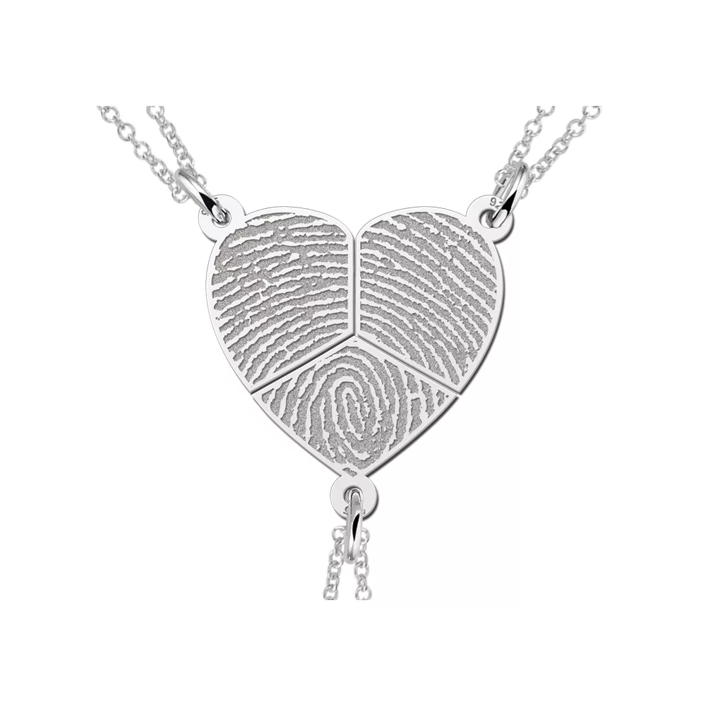 Deze 925 Sterling zilveren vriendschapsketting met vingerafdruk is samengesteld uit drie hangers die samen een hartje vormen.