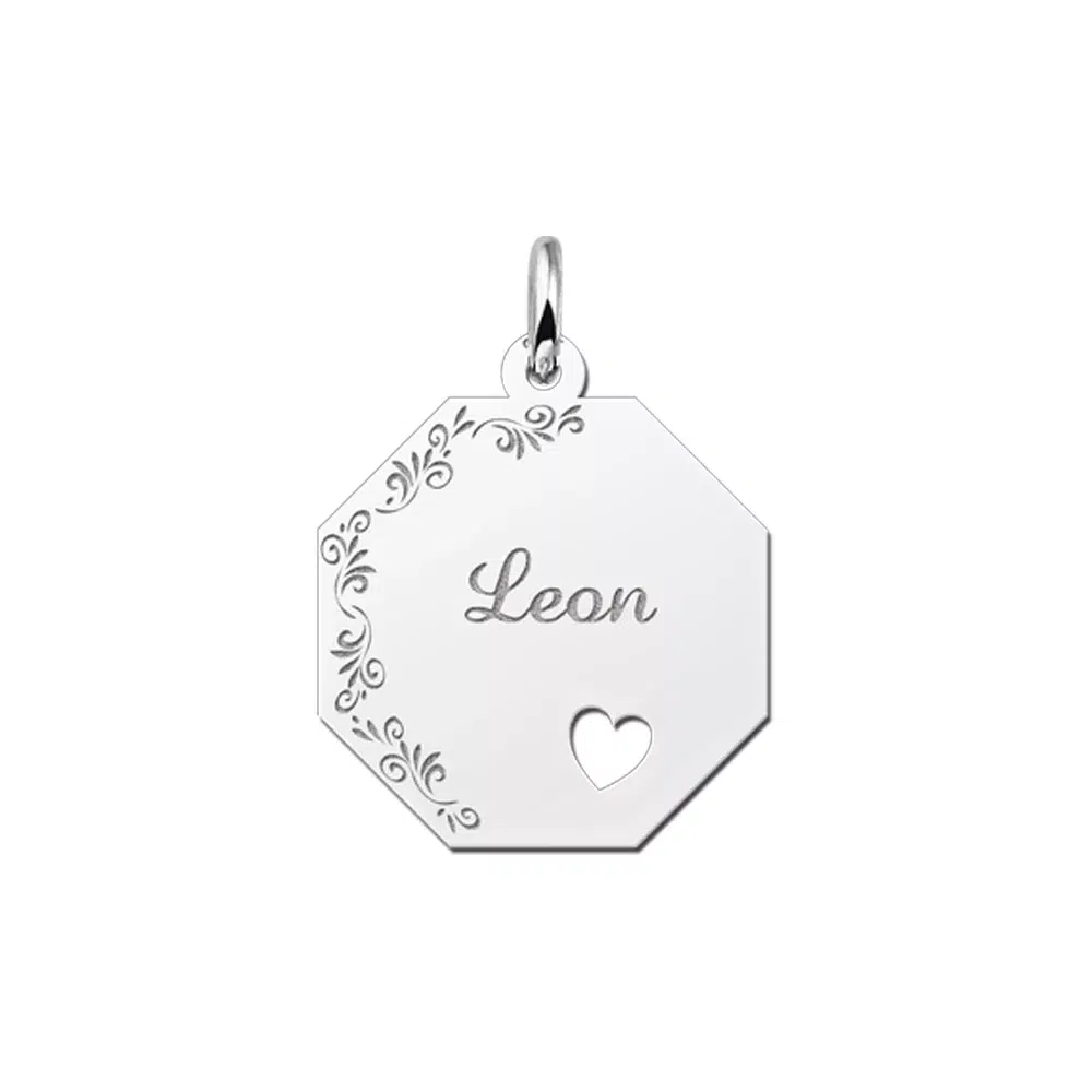 Deze zilveren graveerplaat met je naam heeft een mooie achtkantige vorm van 19 x 19 mm groot en is buiten gewoon chic bewerkt met een smaakvolle bloemetjes gravure.