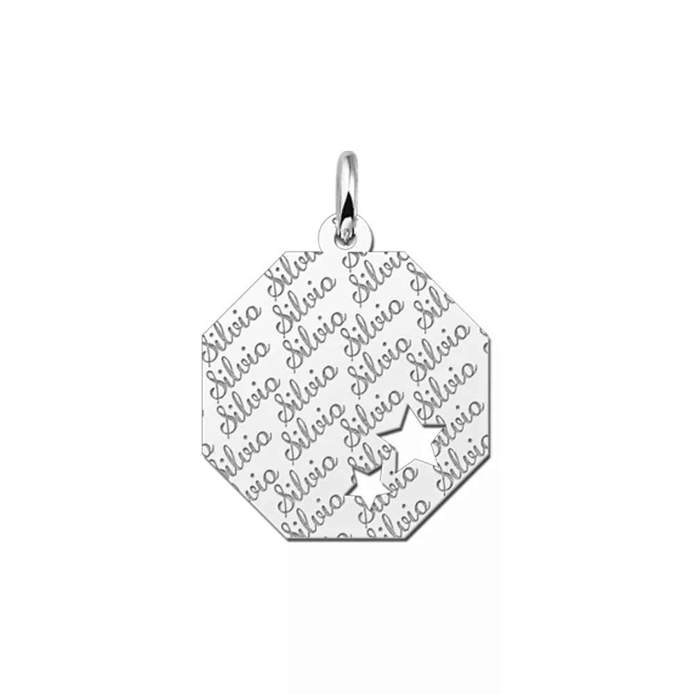 Een zilveren graveerplaatje met een naam acht kantig wat je hier ziet is ca. 19 x 19 mm groot.