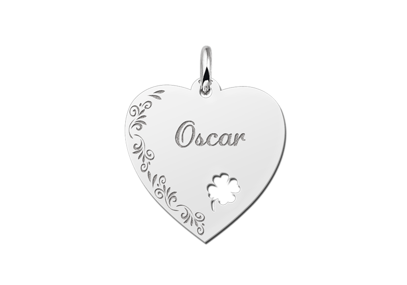 Het zilveren graveerplaatje hart is ca. 19 x 19 mm groot met een elegante bloem gravure. Het graveerplaatje wordt voorzien van een klaver4 en uiteraard de naam van jouw keuze. De naam wordt in sierlijke letters gegraveerd. Vergeet niet een bijpassende ketting mee te bestellen. Snelle en gratis levering!