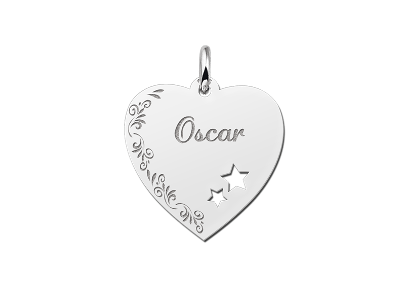 Het zilveren graveerplaatje hart is ca. 19 x 19 mm groot met een elegante bloem gravure. Het graveerplaatje wordt voorzien van sterretje en uiteraard de naam van jouw keuze. De naam wordt in sierlijke letters gegraveerd. Vergeet niet een bijpassende ketting mee te bestellen. Snelle en gratis levering!