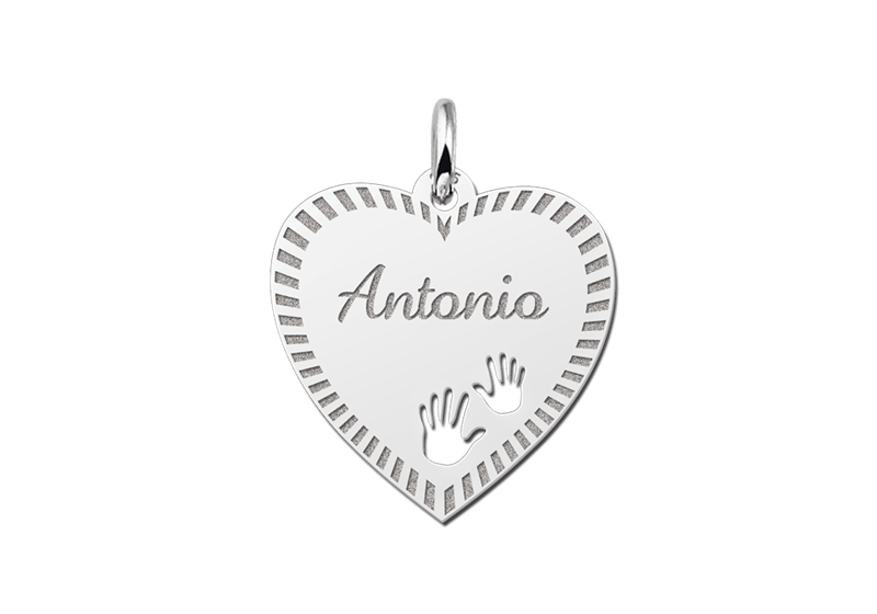 Het zilveren graveerplaatje hart is ca. 19 x 19 mm groot en is omlijst met een sierlijke rand. Het graveerplaatje wordt uiteraard voorzien van de naam van jouw keuze en kinderhandjes. De naam wordt in sierlijke letters gegraveerd. Vergeet niet een bijpassende ketting mee te bestellen. Snelle en gratis levering!