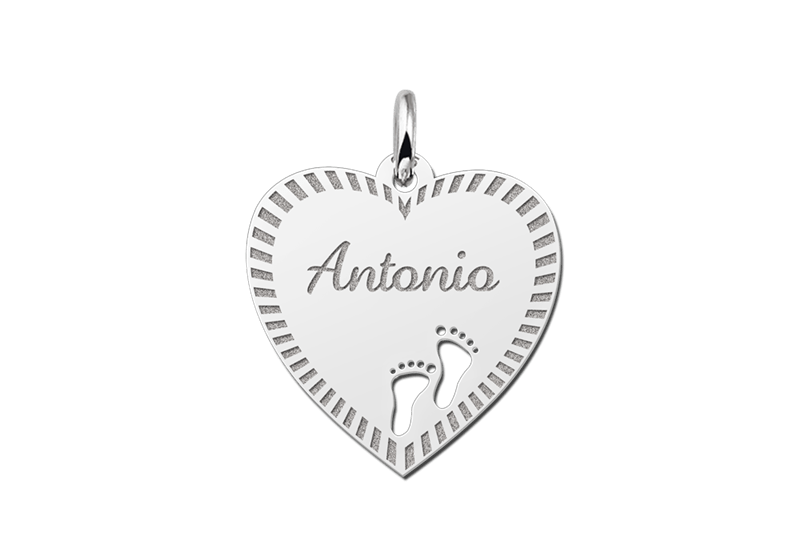 Het zilveren graveerplaatje hart is ca. 19 x 19 mm groot en is omlijst met een sierlijke rand. Het graveerplaatje wordt uiteraard voorzien van de naam van jouw keuze en babyvoetjes. De naam wordt in sierlijke letters gegraveerd. Vergeet niet een bijpassende ketting mee te bestellen. Snelle en gratis levering!