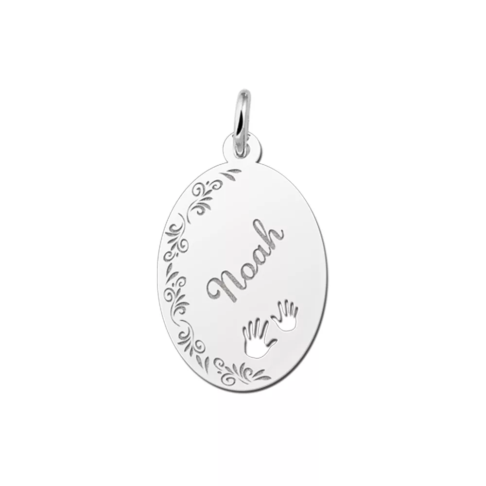 Graveren in deze zilveren hanger! Fantastisch toch? De hanger is van zilver en is 16 x 22 mm en heeft een beeldige bloem gravure ! De zilveren hanger voor je naam gravure heeft 2 beeldige handjes. Het zou dus perfect zijn om de naam van je kindje hierin te laten graveren, die zullen wij dan in sierlijke letters er voor je in graveren. Vergeet niet een bijpassende zilveren ketting, in de juiste lengte mee te bestellen!