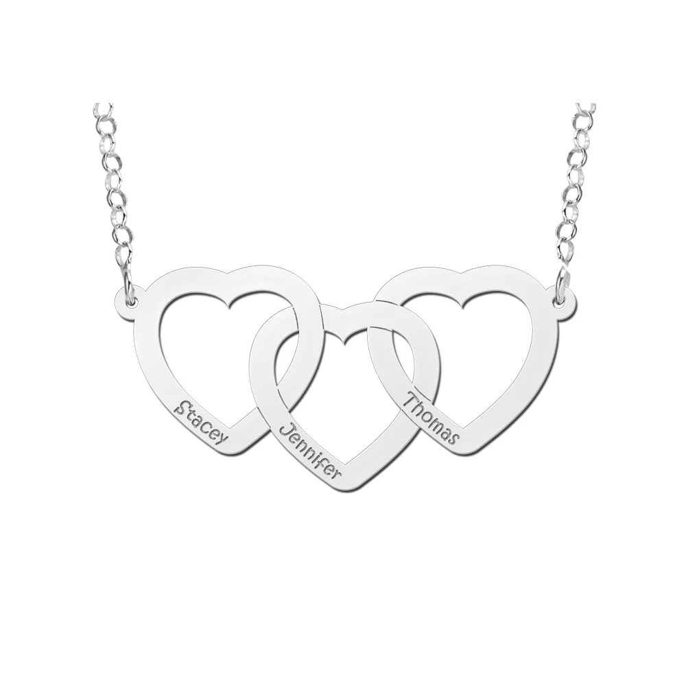 Een mooie 925 Sterling zilveren hanger met drie hartjes welke je kunt personaliseren met maar liefst drie gravures. De hartjes hanger is 40 mm x 19 mm groot en 0,7 mm dik. Je kunt de hanger zowel met als zonder ketting bestellen. Je kunt kiezen uit diverse kettinglengten en –soorten. Je ontvangen de zilveren hartjes ketting in een smaakvol sieradendoosje. Cadeautje voor jezelf of voor iemand anders?
