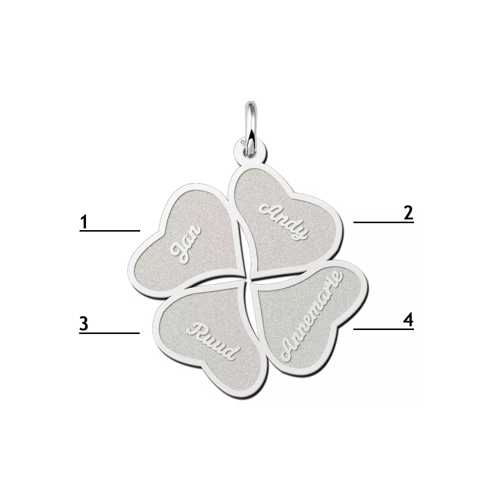 Deze 925 Sterling zilveren hanger heeft de vorm van een klavertje vier. Er is plek voor vier gravures. De zilveren naamhanger heeft een afmeting van 22,5 mm x 22,5 mm en een dikte van 0,7 mm. Je kunt kettinglengte 38-42 cm of 45-50 cm kiezen. Daarnaast hebben we diverse types kettingen in ons assortiment. Alles mooi verpakt in een sierlijk sieradendoosje.