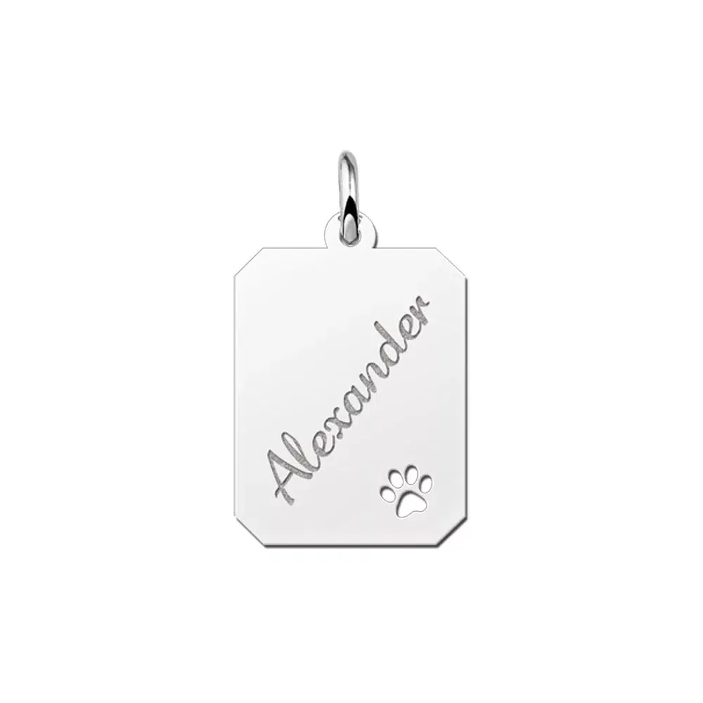 Geef de gewenste naam door en wij graveren voor jou een mooie zilveren naamsieraad rechthoek met pootje.