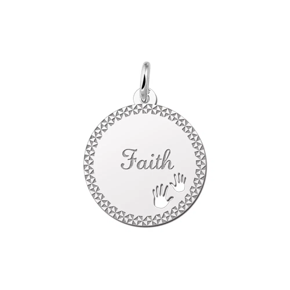 Dit zilveren plaatje is rond en is ca. 19 x 19 mm groot en heeft als afwerking een elegante sierlijke rand. In het zilveren graveerplaatje zijn ook nog twee handjes verwerkt, het is toch geweldig! Dit plaatje met je naam van je kindje erin. Dit zilveren plaatje met naam en deze prachtige sierrand wordt voor jou gegraveerd met een naam naar jouw keuze! Vergeet vooral niet een bijpassende ketting mee te bestellen.