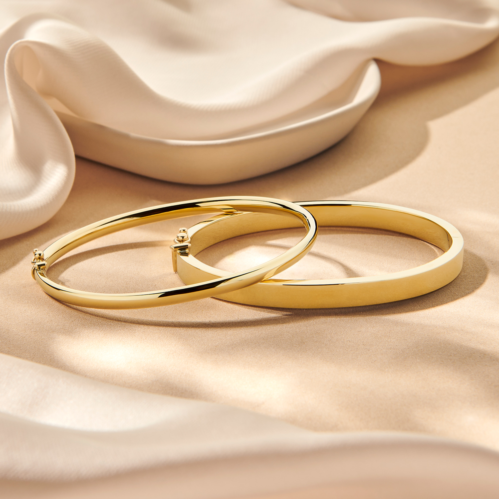 Deze slavenarmband is gemaakt van 14 karaat goud en is voorzien van een scharniersluiting met een veiligheidsachtje.