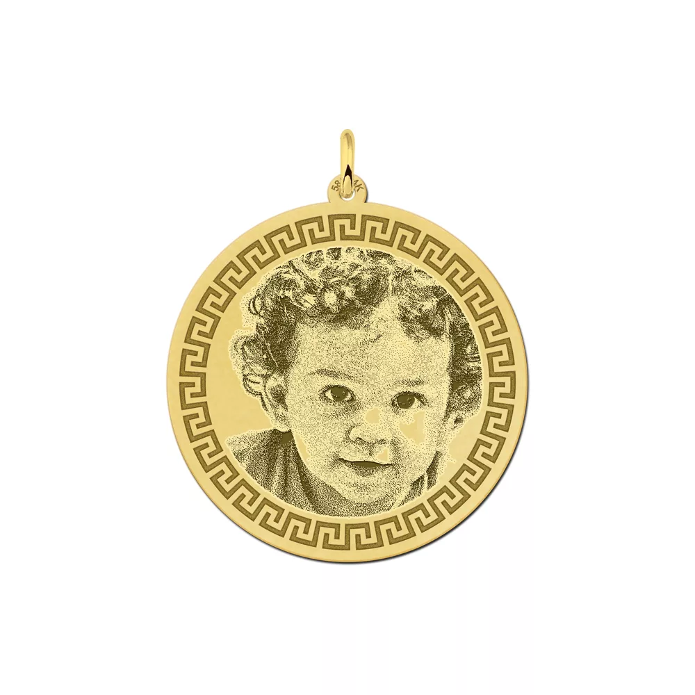 Prachtig rond fotosieraad met meander rand vervaardigd van massief 14 karaat goud. Dit grote gouden foto sieraad heeft een diameter van 33 mm en een dikte van 0,6 mm. In het ronde fotosieraad graveren wij de door jou aangeleverde foto waarvan onze designers een mooie uitsnede maken. De fotogravure kan niet van de hanger afgaan of vervagen omdat de foto echt ín het gouden sieraad gegraveerd wordt. Wij maken de fotogravure via een speciale techniek nog wat donkerder, zo krijgt het ronde fotosieraad meander van goud de perfecte afwerking.