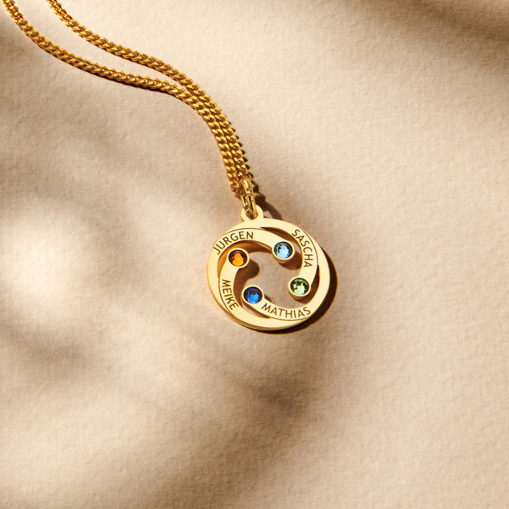 Een mooie ronde hanger met geboortesteentjes. De hanger is gemaakt van 14 karaat goud en kan op verzoek worden gepersonaliseerd tot 4 namen.