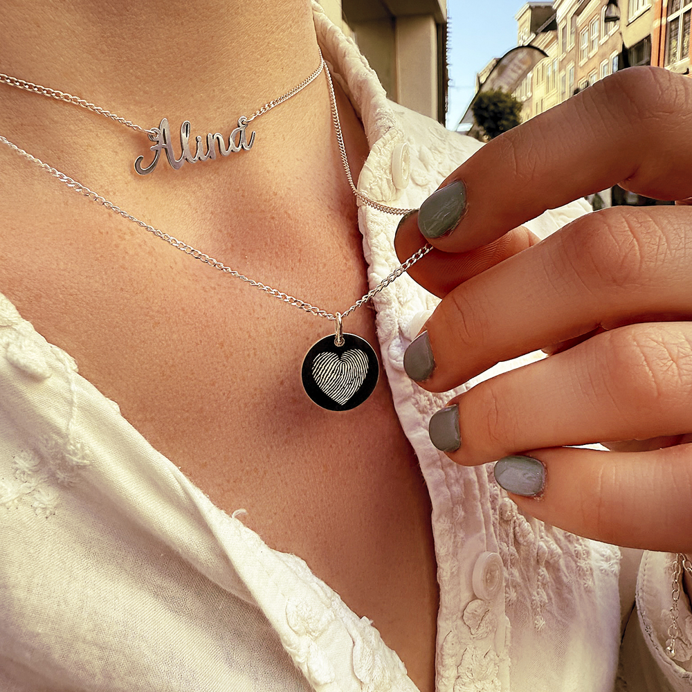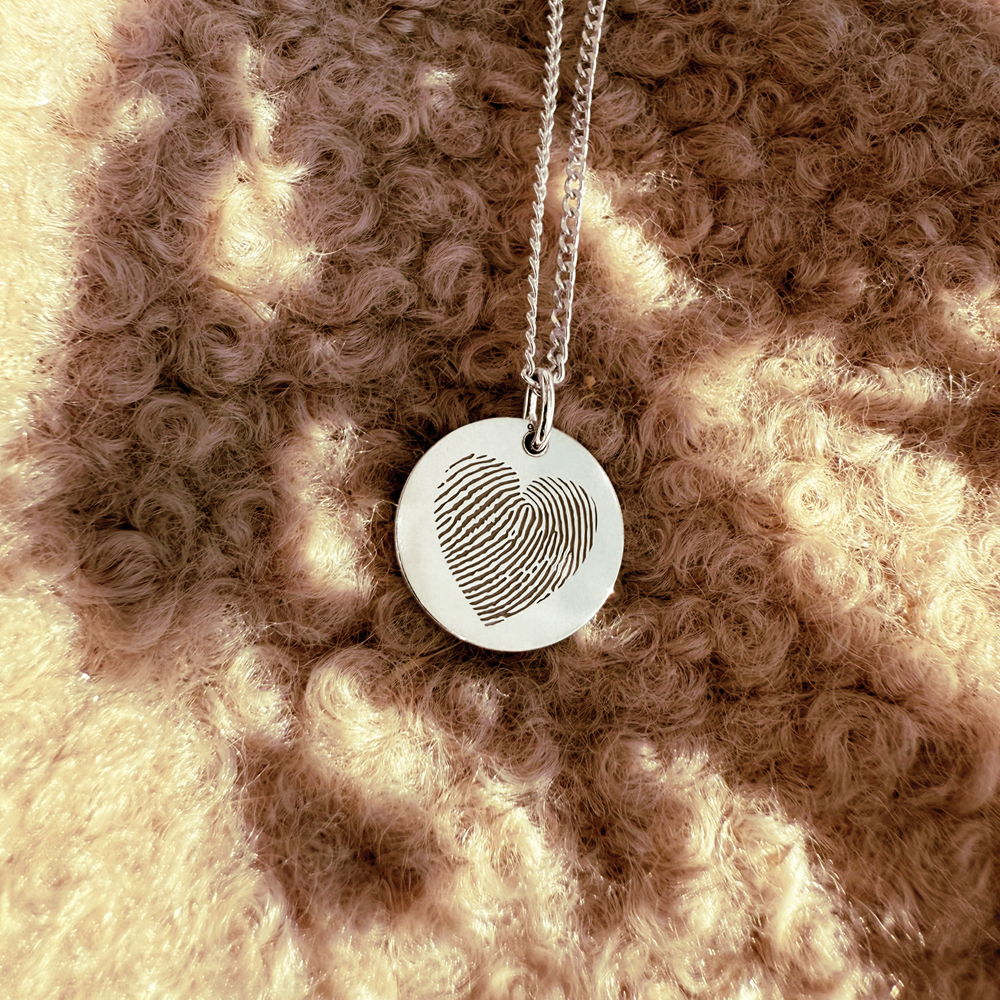 Deze zilveren vingerafdruk hanger heeft een tijdloos en modern ontwerp.