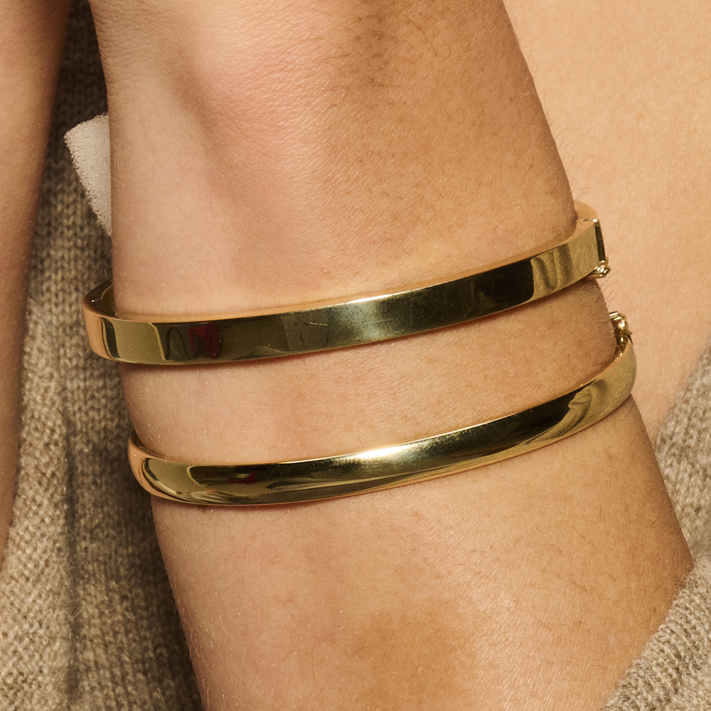 De gouden slavenarmband is mooi glanzend en gemakt van 14-karaat goud. De vlakke armband is 6 mm breed en is voorzien met een scharniersluiting met een veiligheidsachtje.