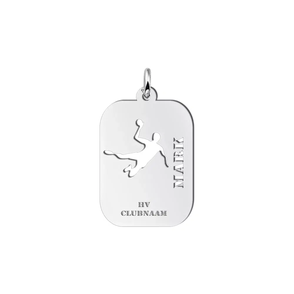 De handbal sport-hanger is ca. 16 x 23 mm. Het is niet noodzakelijk om de naam van je club in te vullen. Als je een regel niet invult, wordt er op die plaats niets gezet.Bijv. alleen een naam is dus ook mogelijk!