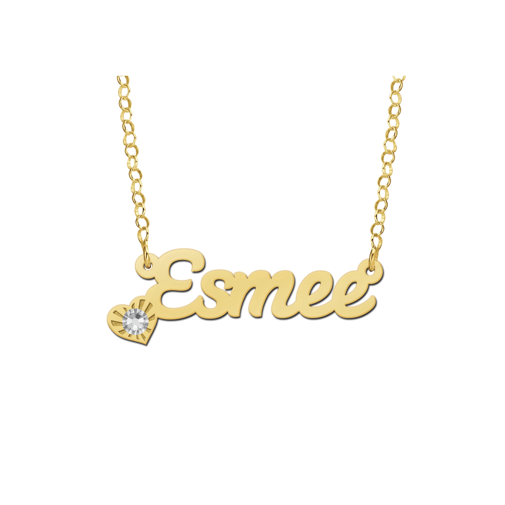 Vergulde naam ketting in fraaie schrijfletters voorzien van een hartje met blinkende zirkonia. Het formaat van een gemiddelde naam van 5 letters is ca. 12 mm hoog x 33mm breed. Deze maat is slechts ter indicatie! De naam dikte is 0, 6 mm.