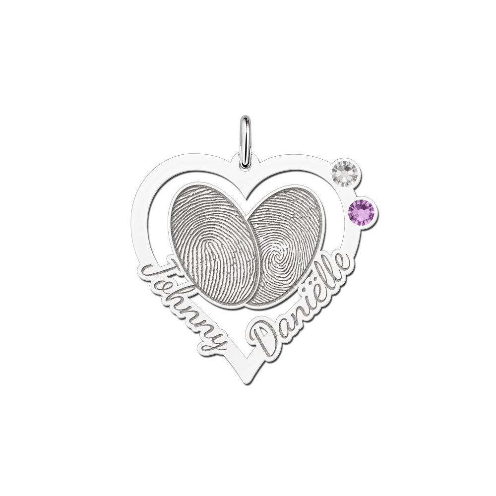 Vingerafdruk sieraad zilver met geboortestenen van echt swarovski kristal. Een prachtige vingerafdruk hanger met twee unieke vingerafdrukken verwerkt in een zilveren hart vervaardigt van 925 sterling zilver.