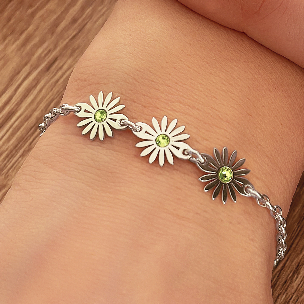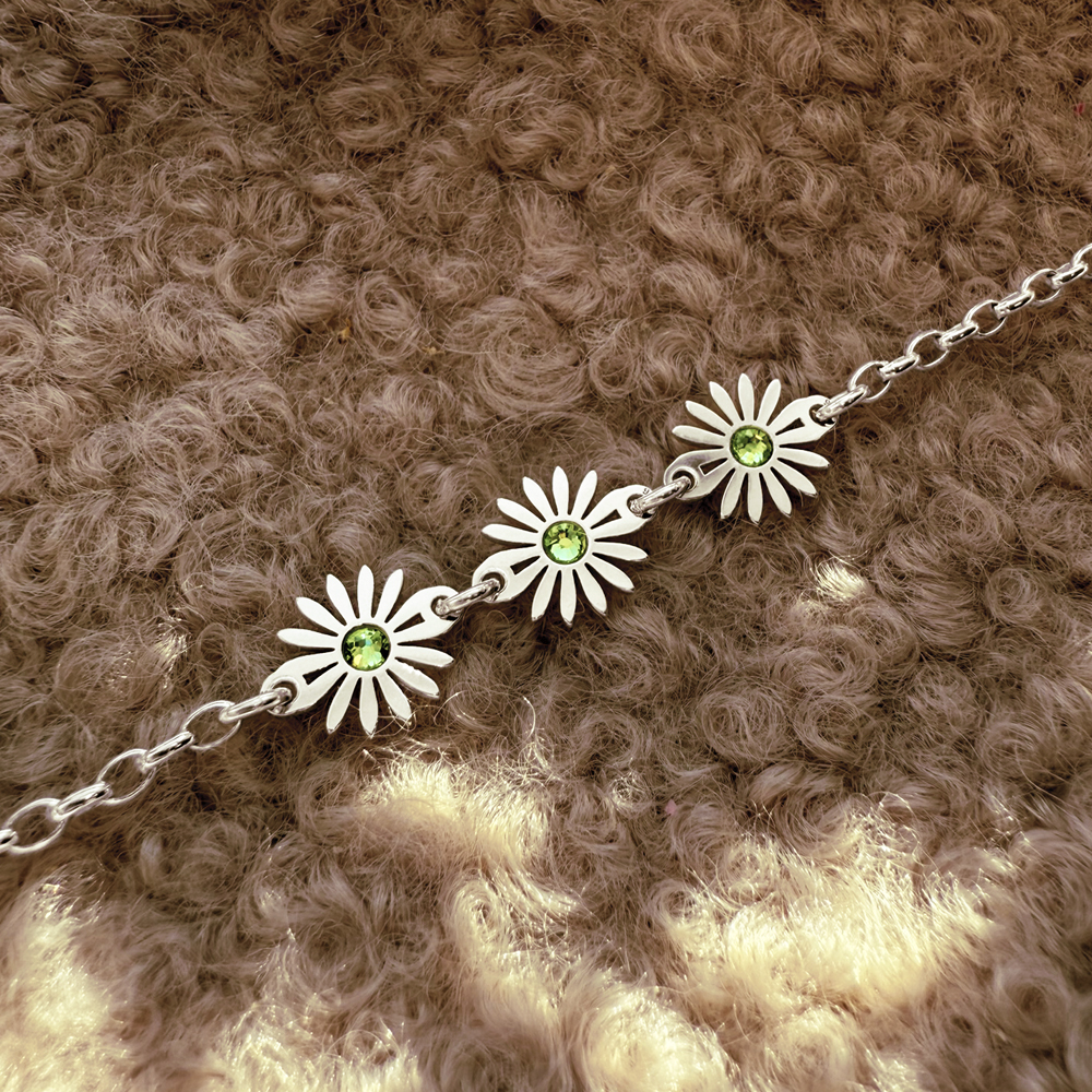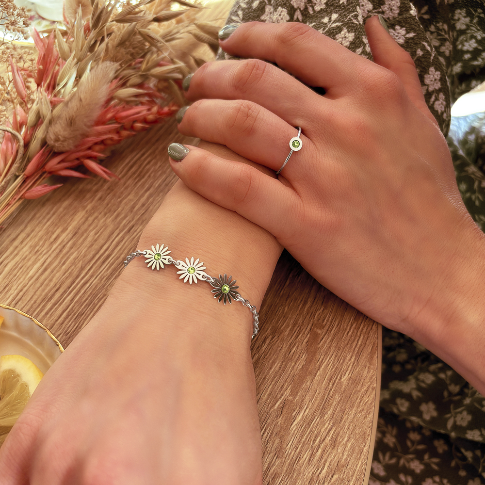 Houd je van een kleine en discrete stijl? Met onze minimalistische sieradencollectie is er voor ieder wat wils. Personaliseer het madeliefjesarmbandje met drie geboortestenen.