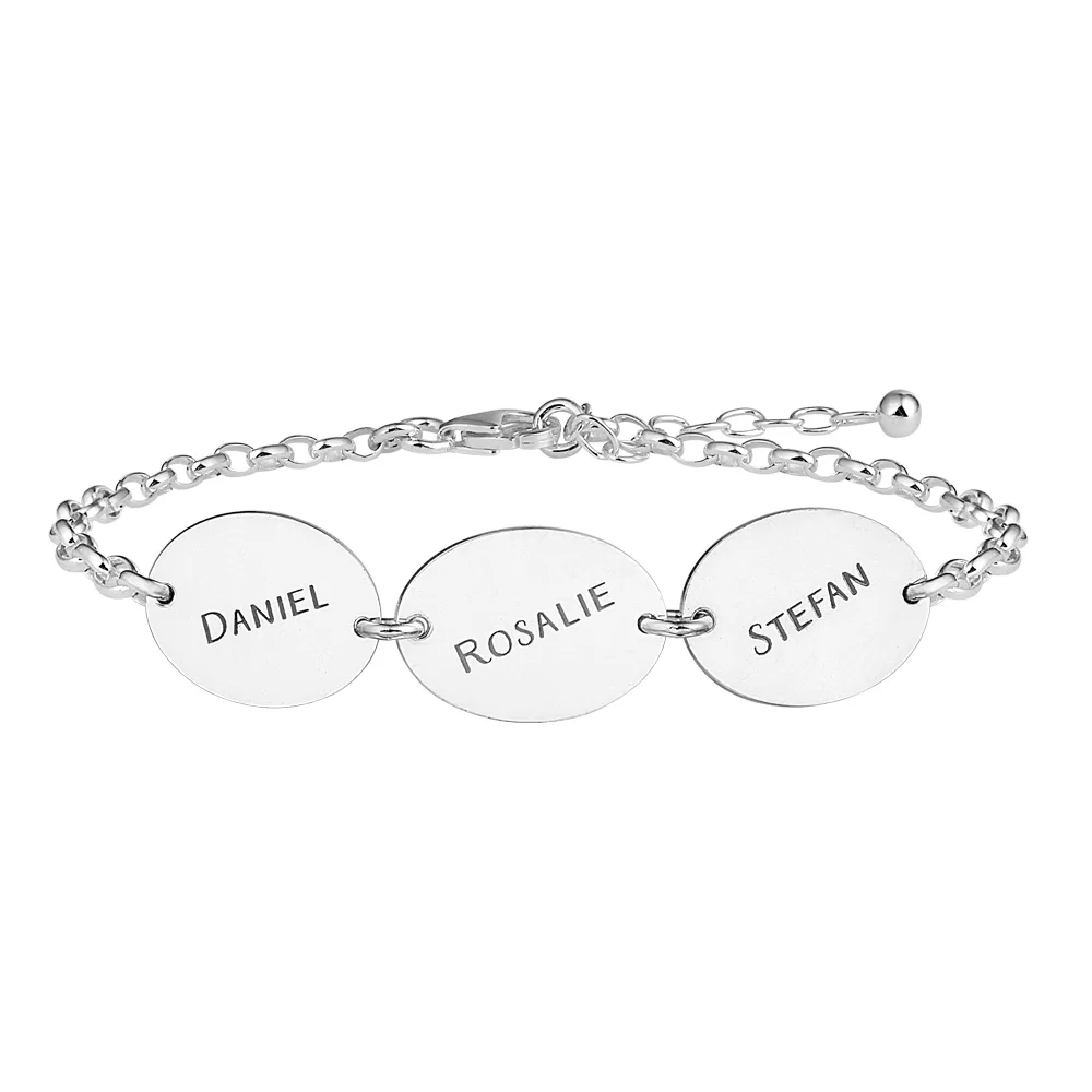 Ben je nog steeds op zoek naar een naamarmband? Dan is je zoektocht ten einde. Deze zilveren naamarmband heeft mooie ovaaltjes die met 3 namen gepersonaliseerd kunnen worden.