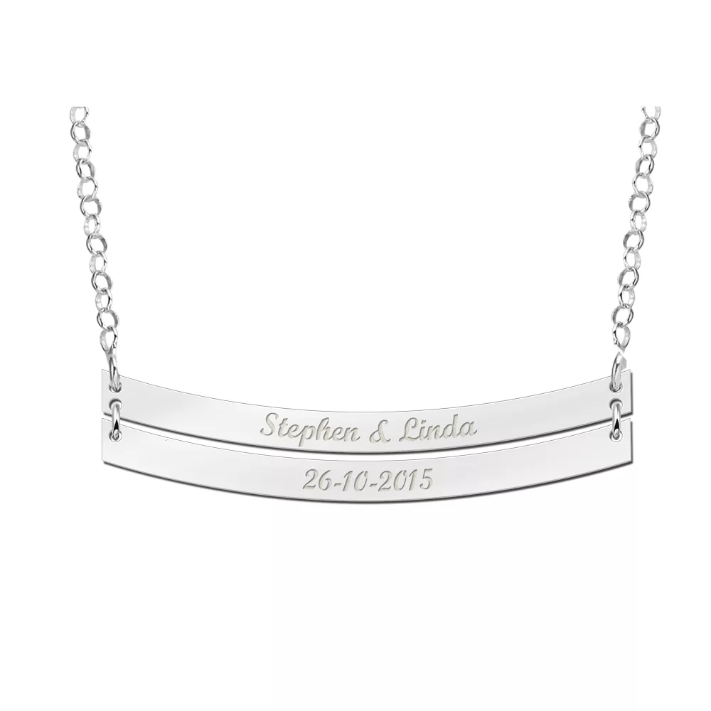 Dit is een zilveren Bar naamketting rond en dubbel. Een super elegante naamketting met bar rond en dubbel, speciaal voor jou! De buitengewone populaire trend van dit moment! Iedereen vindt deze zilveren bar naamketting rond en dubbel helemaal te gek. Wat schitterend om deze zilveren bar naamketting rond en dubbel cadeau te geven voor haar verjaardag. Geef de juiste tekst aan ons door en wij maken er een prachtige zilveren bar naamketting van.