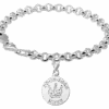 Zilveren bedel kroontje met naam en datum Dit zilveren bedeltje met kroontje wordt voorzien met de naam en datum van jouw keuze. Door de karabijnhaak aan de bedel, kan je het zilveren bedeltje makkelijk aan een armband of collier hangen. De bedel heeft een diameter van 16mm.