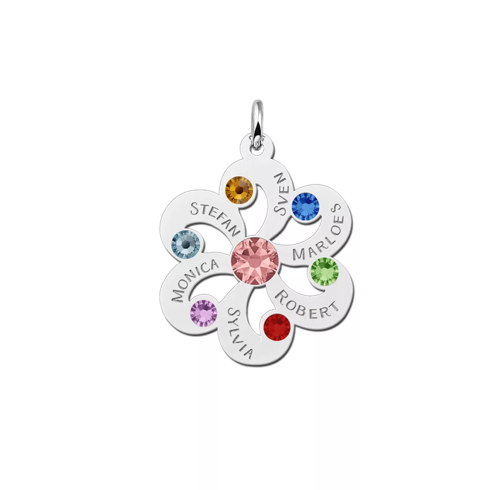 Een prachtige bloem die alle familieleden omarmt. De geboortestenen maken de hanger tot een echte blikvanger. Een kleurrijke hanger met krachtige kleuren. Een symbool van hoop en vreugde.