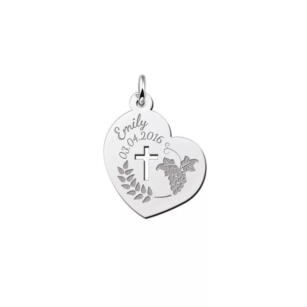 Zilveren communie cadeau hart hanger vervaardigd van echt 925 sterling zilver. Een mooi zilveren hart met daarin de symbolen van de heilige communie. Het kruis, maar ook graan en druiven. In de hanger graveren wij de naam en communiedatum. Maak dit zilveren communie kado compleet met één van onze bijpassende zilveren kettingen. Deze zilveren hart hanger communie kado heeft een afmeting van ca. 16 x 19,5 mm.